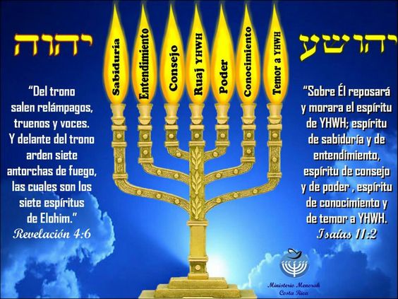 La Menorá es uncandelero con siete brazos que tiene siete llamas siempre encendidas por orden de Dios; las siete llamas representan los siete Espíritus de Dios (Zacarias 4.2); la Menorá es el símbolo más sagrado de la religión hebreo- judaica y era la pieza fundamental de la adoración en el templo de Jerusalén