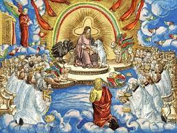 Aquí comienza la Revelación; Juan explica, con simbolismos y figuras, la visión que tiene con los ojos del alma, desde la puerta abierta del cielo, de los cuatro vivientes llenos de ojos por delante y por detrás.